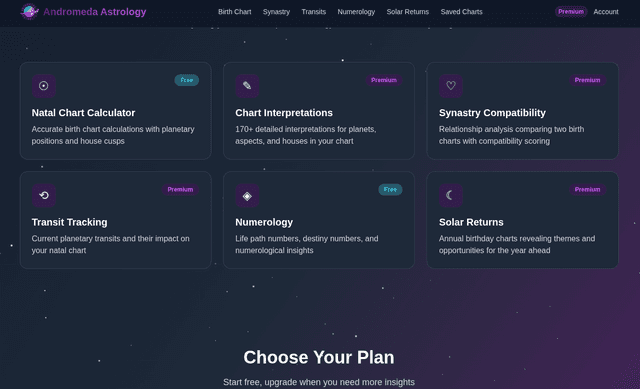 Full-featured astrology web app for generating birth charts, synastry compatibility reports, transits, solar returns, and numerology readings with PDF export functionality.